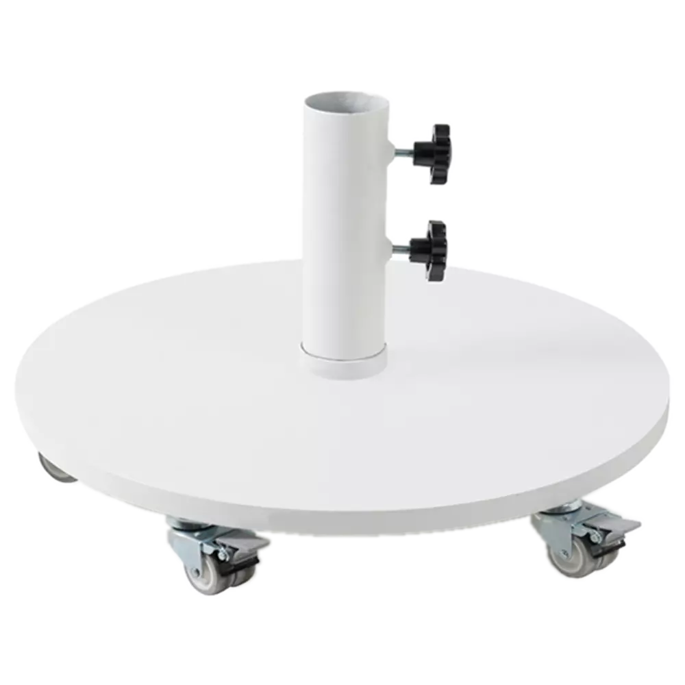 База обважнювач з колесами для парасолі. Підходить до парасолі з діаметром 300 см і більше, має кріпильні болти для стійкості парасолі, а також коліщатка для переміщення повної конструкції.