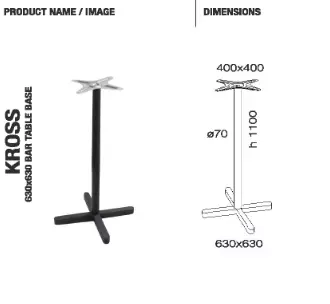 База стола KROSS BAR 63x63x110 см, прекрасно доповнює сучасний дизайн. Блиск і граціозність бази для столу привнесе в інтер'єр особливу гармонію і витонченість. Чудово поєднується з будь якими стільцями, а стільницю можна підібрати з матеріалу на ваш розсуд: дерево, мармур, міцний пластик, МДФ, ламінована ДСП і інші. Простий монтаж опори до стільниці не вимагає специфічних знань, завдяки цьому Ви зможете з легкістю зробити для себе стильний офісний або обідній стіл. Можна використовувати на вулиці і в приміщенні.