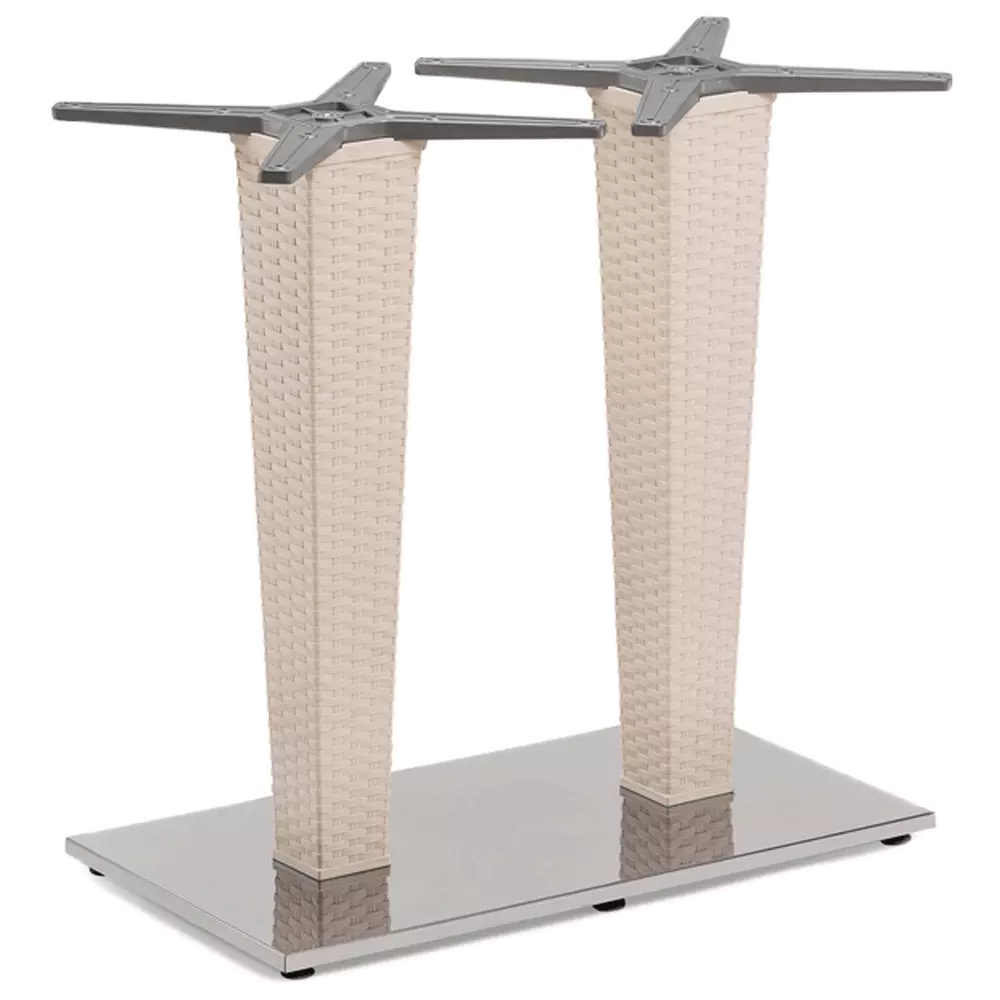 База столу з подвійними ніжками під ротанг з алюмінієвої опорою, максимально стійка і довговічна. Більш того, не схильна до механічних пошкоджень, що говорить про збереження привабливого товарного вигляду на довгі роки. Плюси даної моделі в її експлуатаційних якостях і в оригінальному, естетичному дизайні. Підходить для комбінування зі стільницями Antares 70×70, 80×80, 80×120 и 90×150. Основа представлена в шести різних кольорах: чорний, дерево, венге, кремовий, кава і слонова кістка.