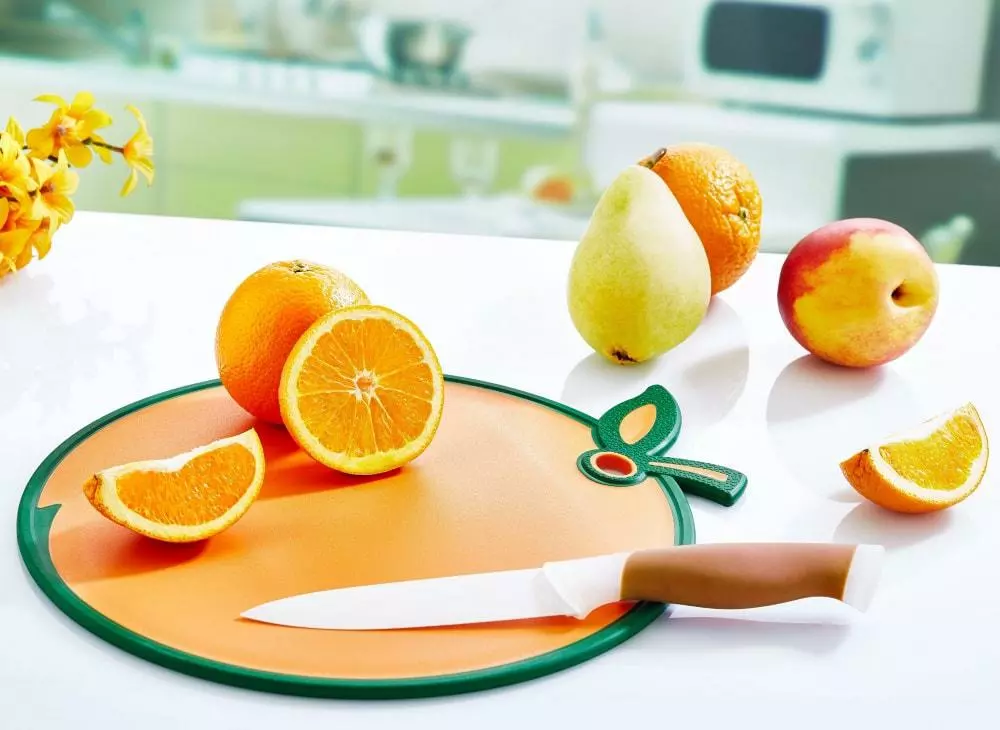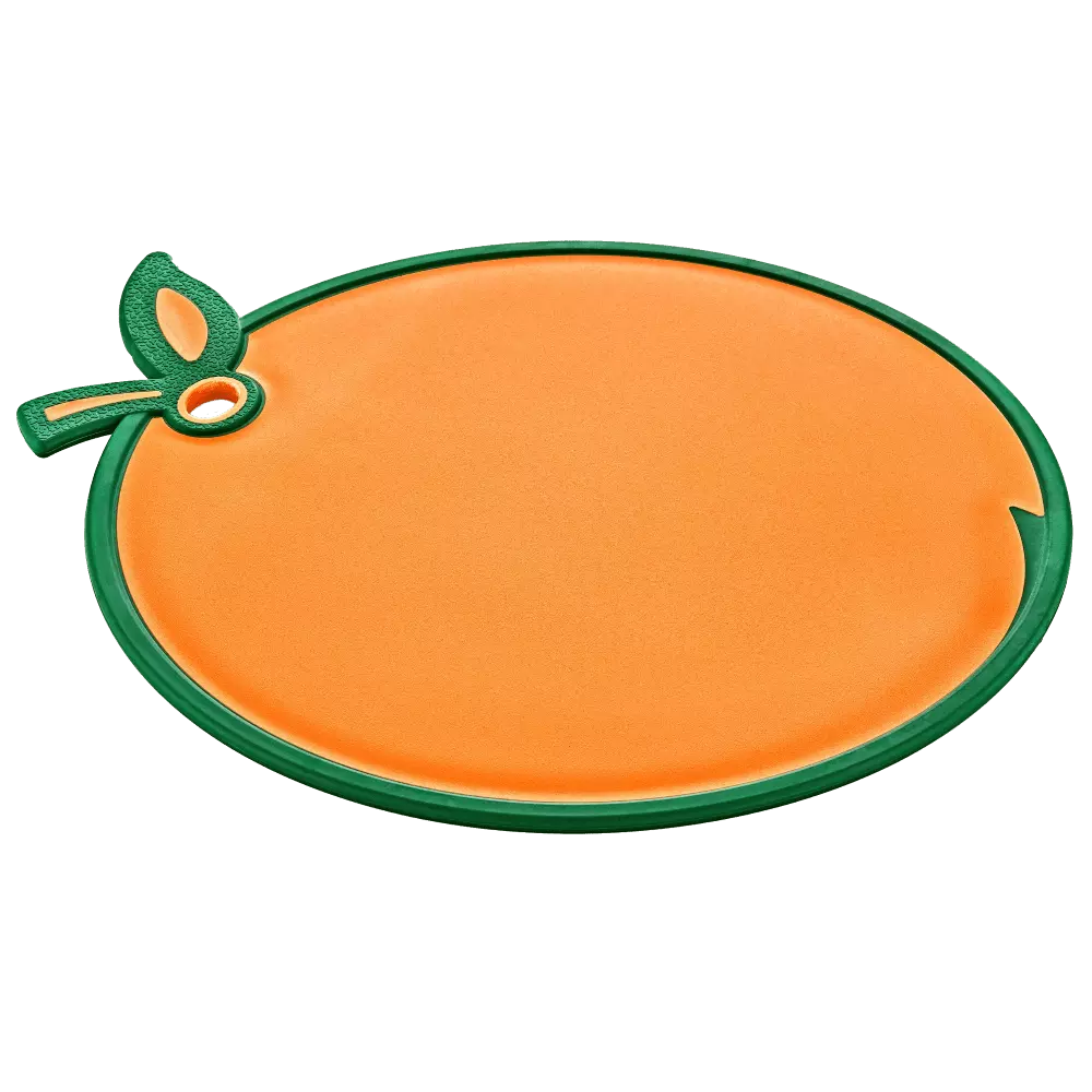 Дошка обробна в формі із забарвленням апельсина - практичний і яскравий атрибут на кухні. Прогумовані края, запобігають ковзанню по столу, є отвір для підвішування. Виготовлена з якісного пластику, призначеного для контакту з харчовими продуктами.