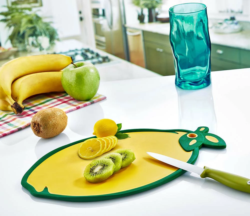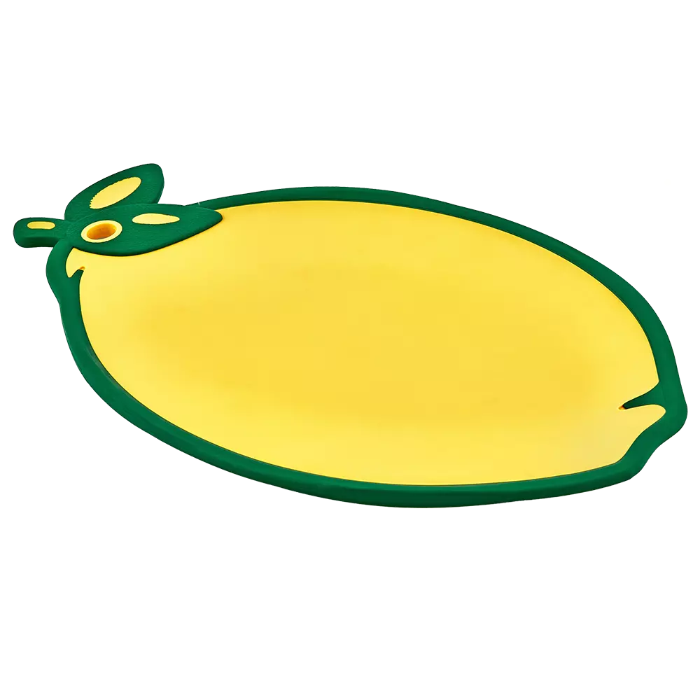 Дошка обробна в формі із забарвленням лимона - практичний і яскравий атрибут на кухні. Прогумовані края, запобігають ковзанню по столу, є отвір для підвішування. Виготовлена з якісного пластику, призначеного для контакту з харчовими продуктами.