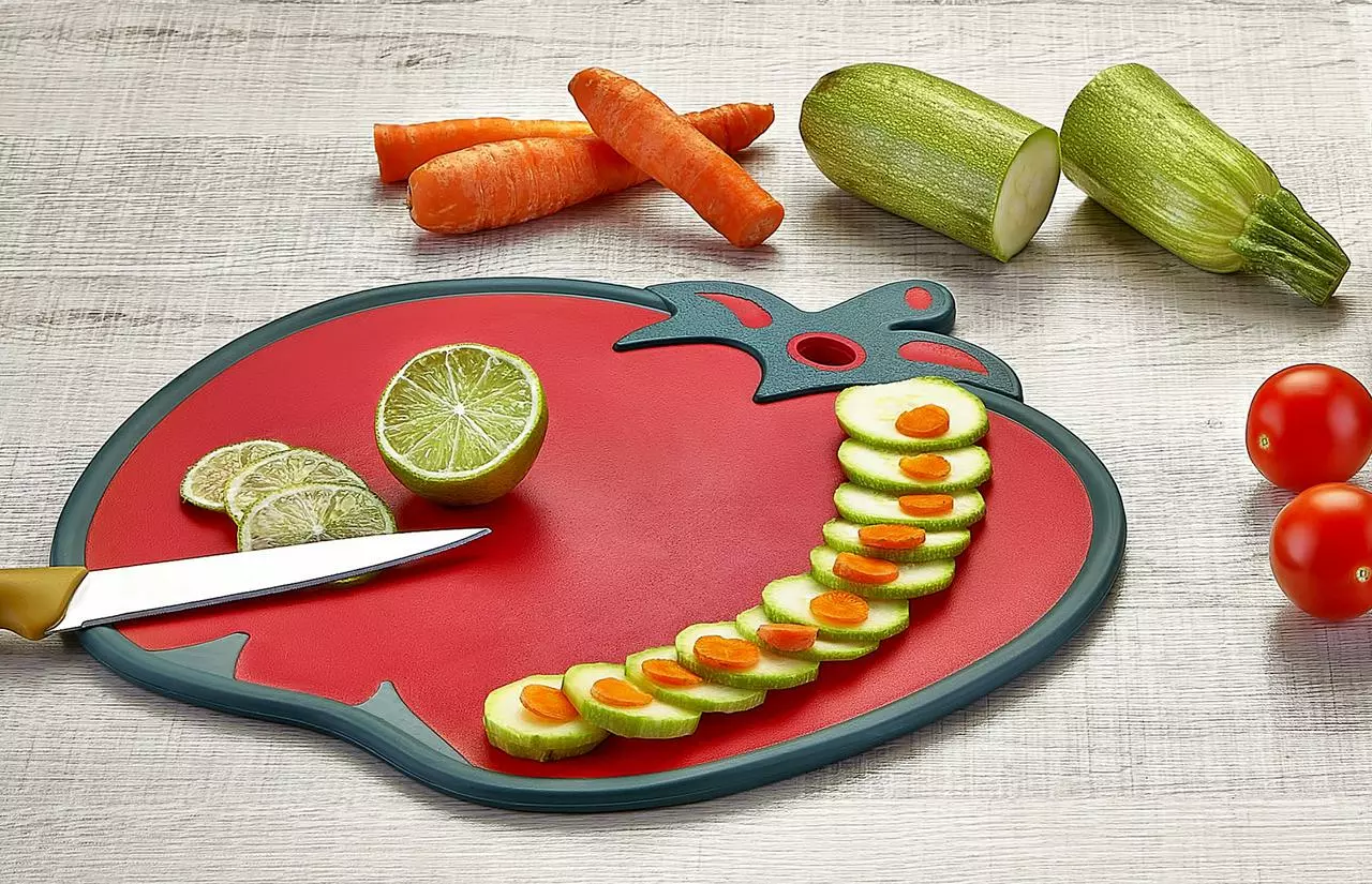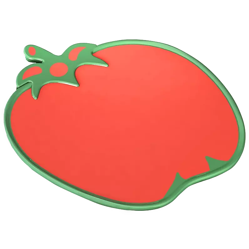 Дошка обробна в формі із забарвленням помідора - практичний і яскравий атрибут на кухні. Прогумовані края, запобігають ковзанню по столу, є отвір для підвішування. Виготовлена з якісного пластику, призначеного для контакту з харчовими продуктами.