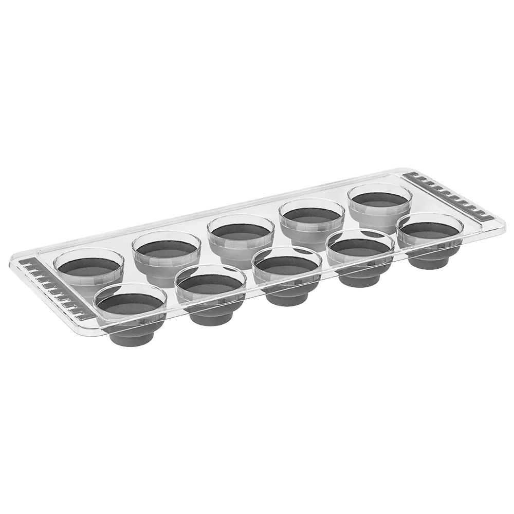 Форма для льоду, має по 10 великих осередків для заморозки. Основа форми пластикова, а осередки силіконові - витягувати лід легко і безпечно. Форма для льоду виготовлена з якісних матеріалів, придатних для контакту з харчовими продуктами.