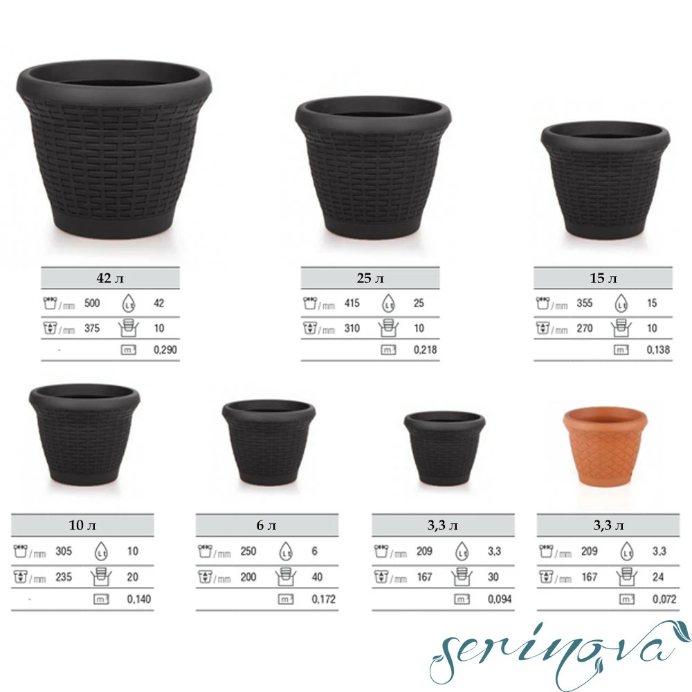Горщик представлений в декількох об'ємах: 3,3 л; 6 л; 10 л; 15 л; 25 л; 42 л.
