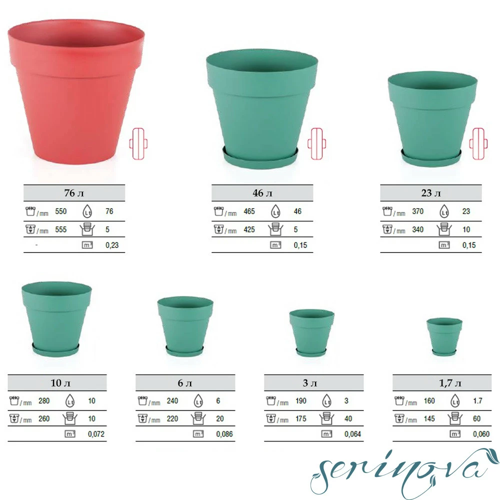Горщик представлений в декількох об'ємах: 1,7 л; 3 л; 6 л; 10 л; 23 л; 46 л; 76 л.