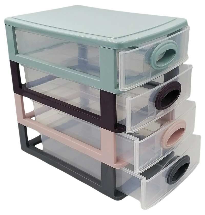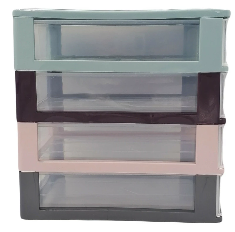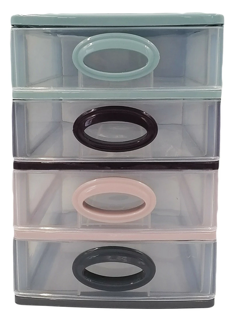 Комод-міні це відмінне рішення для компактного і зручного зберігання дрібних речей. Міні комод в спокійному забарвленні має чотири прозорі висувні секції, кожна секція виймається для зручного догляду. Виріб міцний і стійкий, виконаний з якісного пластику.
