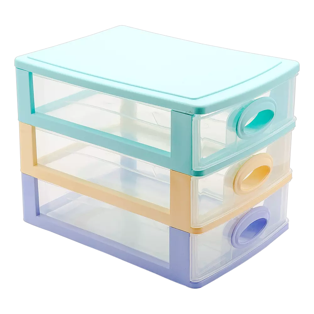Комод-міні це відмінне рішення для компактного і зручного зберігання дрібних речей. Міні комод в спокійному забарвленні має три прозорі висувні секції, кожна секція виймається для зручного догляду. Виріб міцний і стійкий, виконаний з якісного пластику.