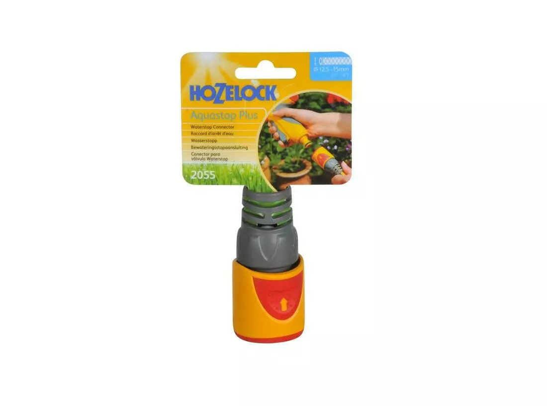 Конектор HoZelock 2055 Aquastop Plus (12,5 мм и 15 мм). Підходить для використання з усіма шлангами діаметром 12,5 мм (1/2 дюйма) и 15 мм (5/8 дюйма). Внутрішній клапан припиняє подачу води, якщо аксесуар (наприклад, пістороків-розпилювач) від'єднати від шланга. Це позбавляє від необхідності вимикати воду, при зміні насадок, що знижує витрату води на ділянці.