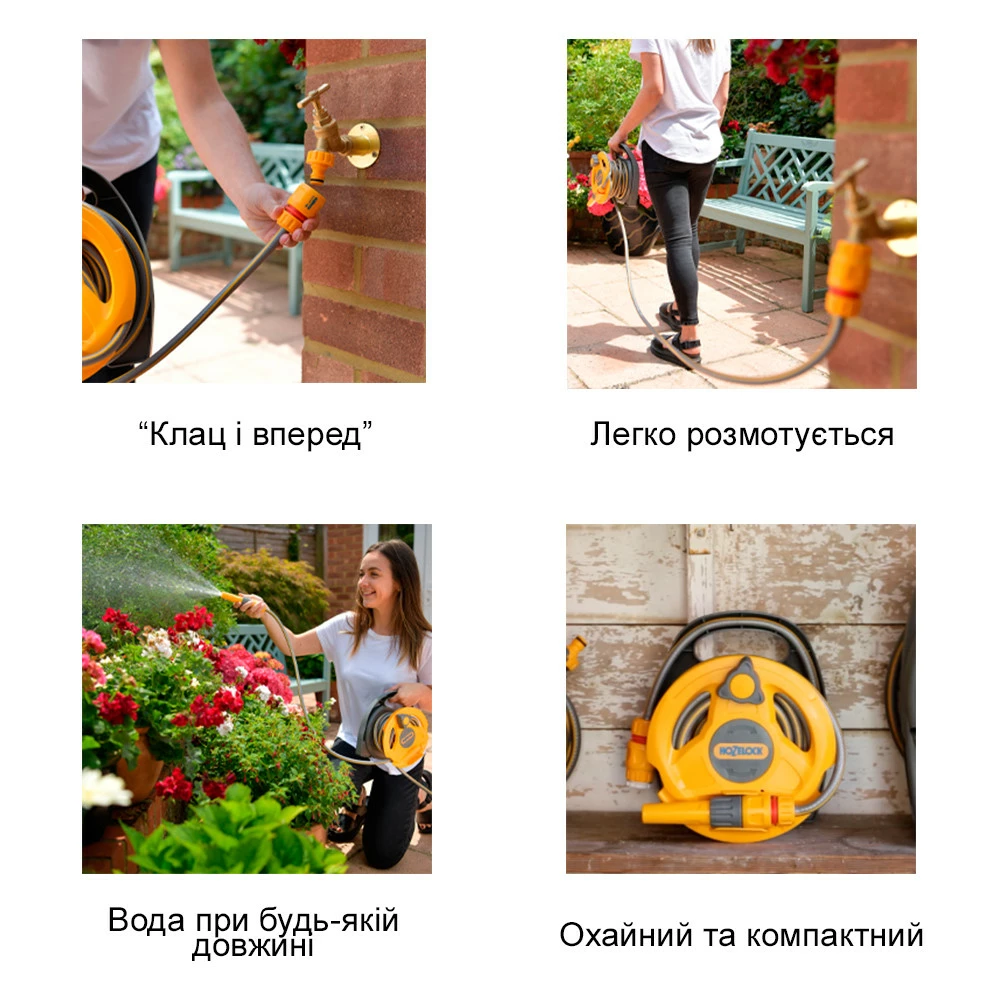 Котушка Micro Reel HoZelock 2427 Click & Go - простий і легкий полив без суєти. Конструкція котушки працює за принципом «клацни і працюй», ідеальна для поливу невеликих площ, таких як дворики, невеликі газони, теплиці і балкони.