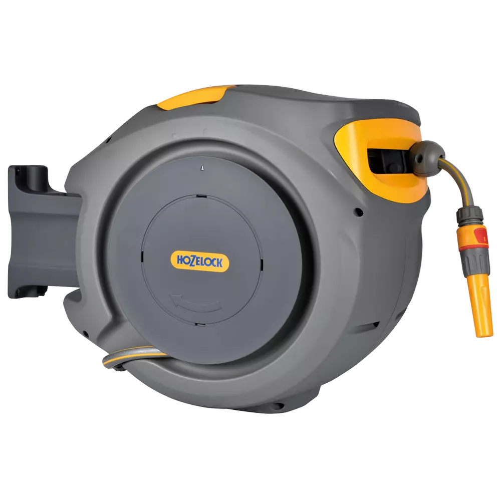 - Міцний настінний кронштейн дозволяє Auto Reel повертатися на 180 градусів, дозволяючи поливати найбільш віддалені ділянки саду і забезпечує компактне зберігання, притуливши котушку до стіни.