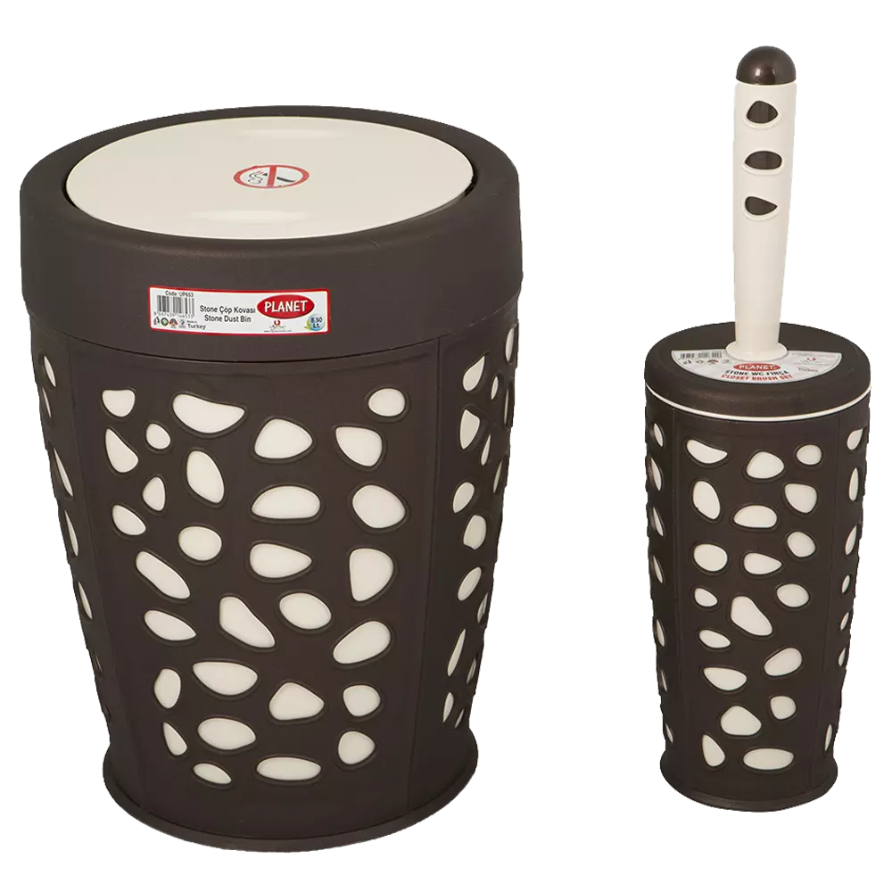 Лінійка наборів для ванної кімнати STONE має сучасний дизайн в поєднанні з функціональністю і практичністю. Особливістю даної моделі є рельєфний малюнок з переплетенням двох виробів. Палітра кольорів дає можливість підібрати набір під будь-який інтер'єр. Набір складається з двох предметів: щітка для туалету і корзина для сміття з поворотною кришкою, за допомогою якої не видно вмісту відра, що допоможе вам зробити ванну ще більш естетичною. У йоржика використана ліва різьба (при з'єднанні йоржа з ручкою, потрібно обертати йорж проти годинникової стрілки). Вироби зроблять вашу ванну більш затишною і різноманітною. Товар виготовлений з міцного пластику.