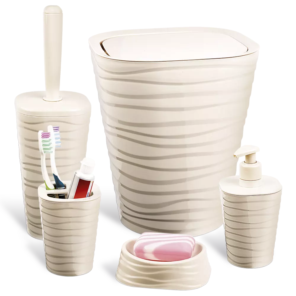 Лінійка наборів для ванної кімнати WELLE має сучасний дизайн в поєднанні з функціональністю і практичністю. Особливістю даної моделі є хвиляста структура виробу. Палітра пастельних кольорів дає можливість підібрати набір під будь-який інтер'єр. Набір складається з п'яти предметів: корзина для сміття, щітка для туалету, дозатор для рідкого мила, мильниця, органайзер для зубних щіток. У йоржика використана ліва різьба (при з'єднанні йоржа з ручкою, потрібно обертати йорж проти годинникової стрілки). Товар виготовлений з якісного пластика.