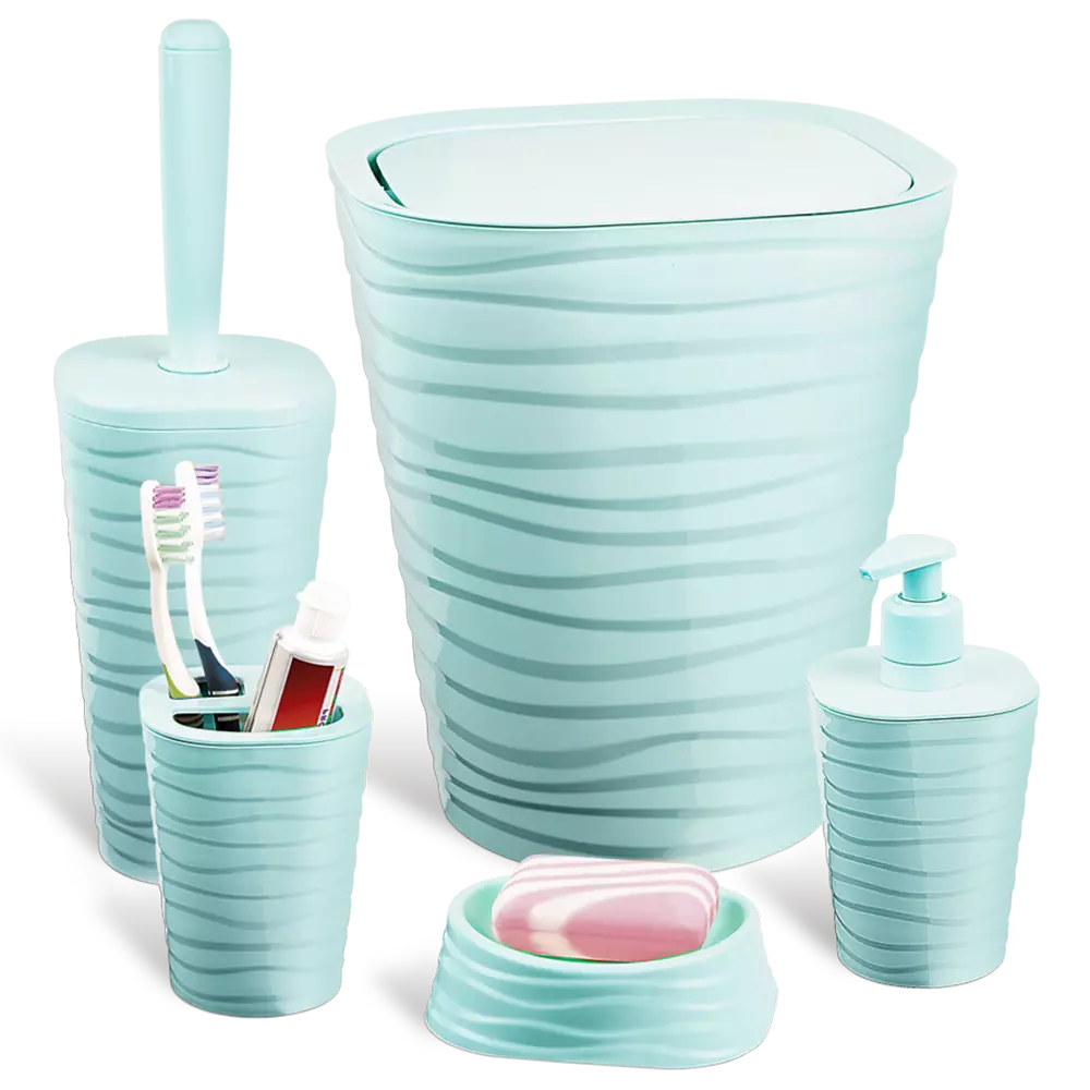 Лінійка наборів для ванної кімнати WELLE має сучасний дизайн в поєднанні з функціональністю і практичністю. Особливістю даної моделі є хвиляста структура виробу. Палітра пастельних кольорів дає можливість підібрати набір під будь-який інтер'єр. Набір складається з п'яти предметів: корзина для сміття, щітка для туалету, дозатор для рідкого мила, мильниця, органайзер для зубних щіток. У йоржика використана ліва різьба (при з'єднанні йоржа з ручкою, потрібно обертати йорж проти годинникової стрілки). Товар виготовлений з якісного пластика.
