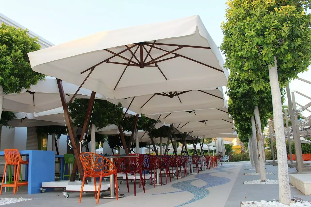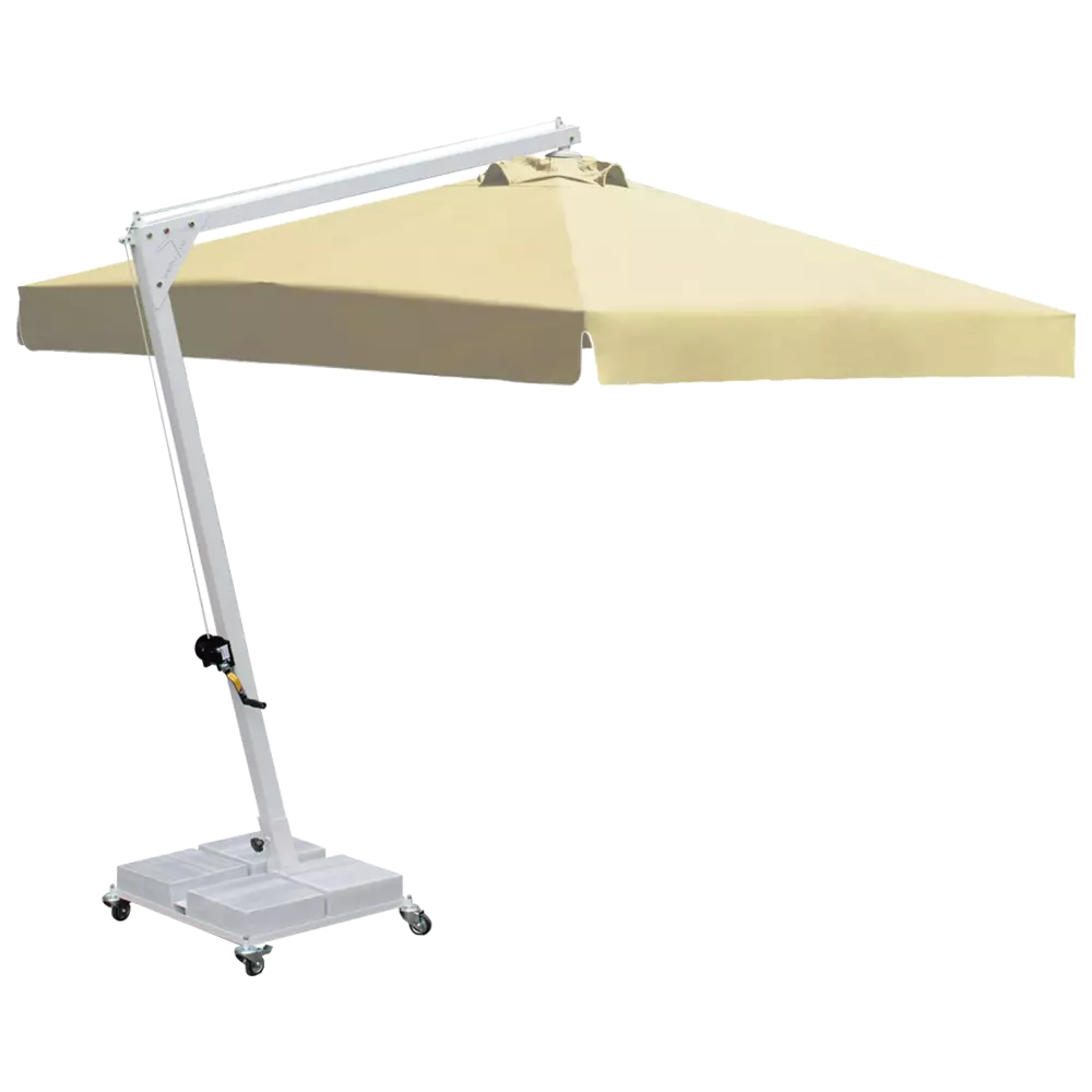 Професійна парасоля захистить від яскравих сонячних променів і створить приємну затінену атмосферу в приватних садах, зони біля басейну, відкритих літніх майданчиках кафе, барів і ресторанів. Виконання купола можливо з трьох тканин: бежевий поліестер, олефін і акрил. Варіанти забарвлення представлені в кольоровій палітрі для тканини олефін і акрил. Покриття опори і спиць можна вибрати з представленої палітри, в чорному кольорі + 10% до вартості виробу. Ціна на сайті вказана за тканину бежевий поліестер, вартість купола з тканини акрил і олефін уточнюйте у менеджера.
