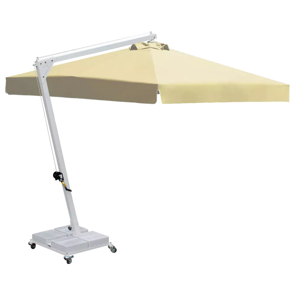 Професійна парасоля захистить від яскравих сонячних променів і створить приємну затінену атмосферу в приватних садах, зони біля басейну, відкритих літніх майданчиках кафе, барів і ресторанів. Виконання купола можливо з трьох тканин: бежевий поліестер, олефін і акрил. Варіанти забарвлення представлені в кольоровій палітрі для тканини олефін і акрил. Покриття опори і спиць можна вибрати з представленої палітри, в чорному кольорі + 10% до вартості виробу. Ціна на сайті вказана за тканину бежевий поліестер, вартість купола з тканини акрил і олефін уточнюйте у менеджера.