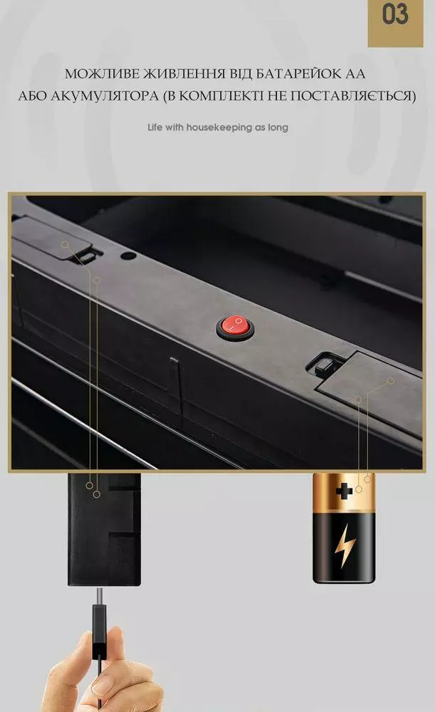 - У комплекті акумулятор (зарядка через USB кабель) і касета для батарейок