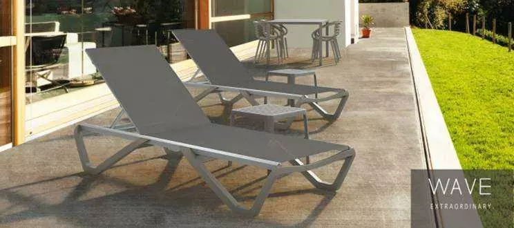 Шезлонг Wave незамінний при відпочинку на дачі, у моря або біля басейну. Інноваційне покриття з високоміцної сітчастої тканини від провідного французького виробника Serge Ferrari приємно на дотик і надійно в експлуатації. Покриття виготовлено з повітропроникною «дихаючої» тканини. Воно не розтягується і не дає усадку, не боїться вологи, швидко сохне, не вигоряє на сонці і залишається прохолодним на дотик навіть під палючими променями сонця. Покриття володіє антибактеріальними властивостями, в його склад входять натуральні екологічні компоненти. Рама виготовлена з анодованого алюмінію: для матеріалу характерний натуральний металевий блиск, що надає виробу елегантність і респектабельність. Конструкція шезлонга міцна, ергономічна і стійка. Для зручності переміщення модель оснащена коліщатками, допустиме навантаження до 200 кг. Спинку можна регулювати за допомогою розташованих на зворотному боці шезлонга пазів: вона приймає п'ять положень. Виріб стійкий до впливу вологи, УФ-випромінювання, перепадів температур, корозії. Штабелюються до 20 штук.