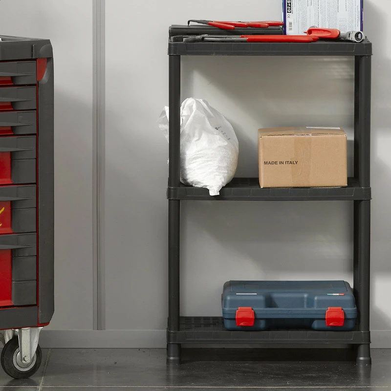 Універсальний пластиковий стелаж на 3 полиці Universal Vent 63-3. Стелаж можна застосовувати для побутових потреб: зберігання будь-яких неважких речей в будинку, гаражі, офісі. Так само, використовують для зберігання або демонстрації товарів в магазинах, торгових рядах, невеликих складах, підсобних приміщеннях. Пластиковий стелаж чорного кольору не мазкий і відмінно впишеться в будь-який інтер'єр. Пластик, на відміну від металу і дерева, не схильний до корозії, йому не страшна волога. Пластикові стелажі не вимагають фарбування, а легка збірка і невелика вага роблять їх дуже практичними і зручними при експлуатації і транспортуванні.