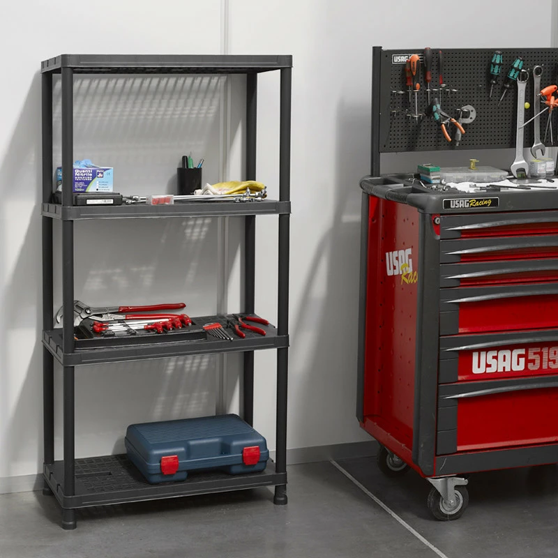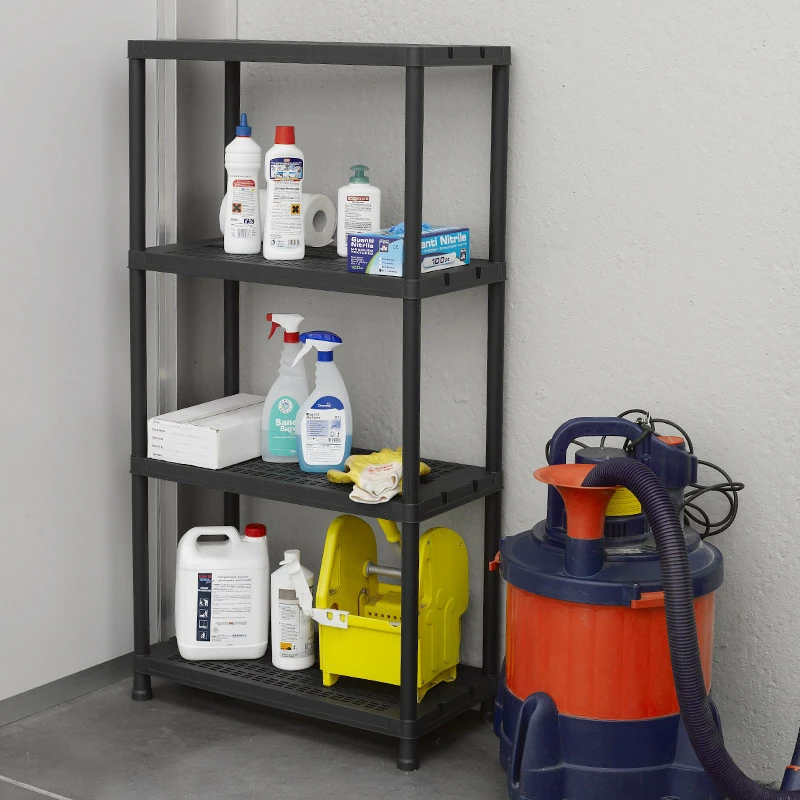Універсальний пластиковий стелаж на 4 полиці Universal Vent 73-4. Стелаж можна застосовувати для побутових потреб: зберігання будь-яких неважких речей в будинку, гаражі, офісі. Так само, використовують для зберігання або демонстрації товарів в магазинах, торгових рядах, невеликих складах, підсобних приміщеннях. Пластиковий стелаж чорного кольору не мазкий і відмінно впишеться в будь-який інтер'єр. Пластик, на відміну від металу і дерева, не схильний до корозії, йому не страшна волога. Пластикові стелажі не вимагають фарбування, а легка збірка і невелика вага роблять їх дуже практичними і зручними при експлуатації і транспортуванні.