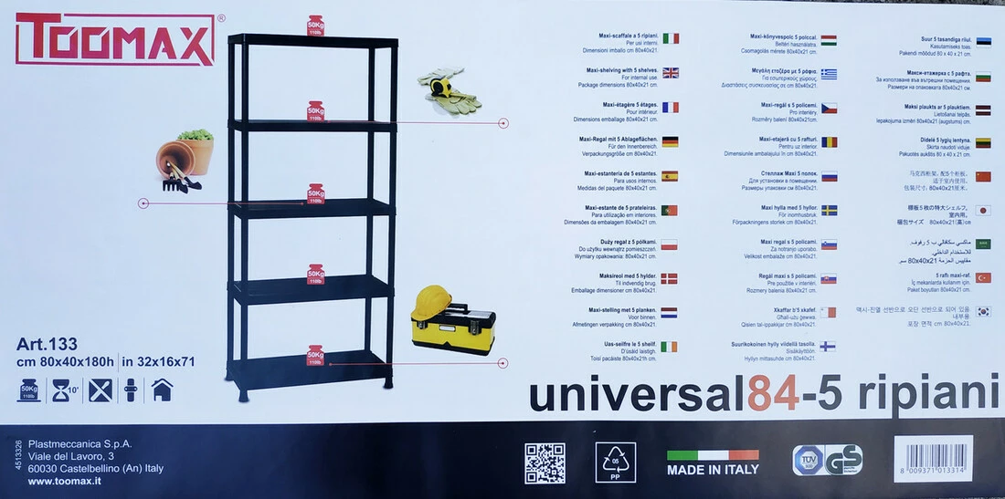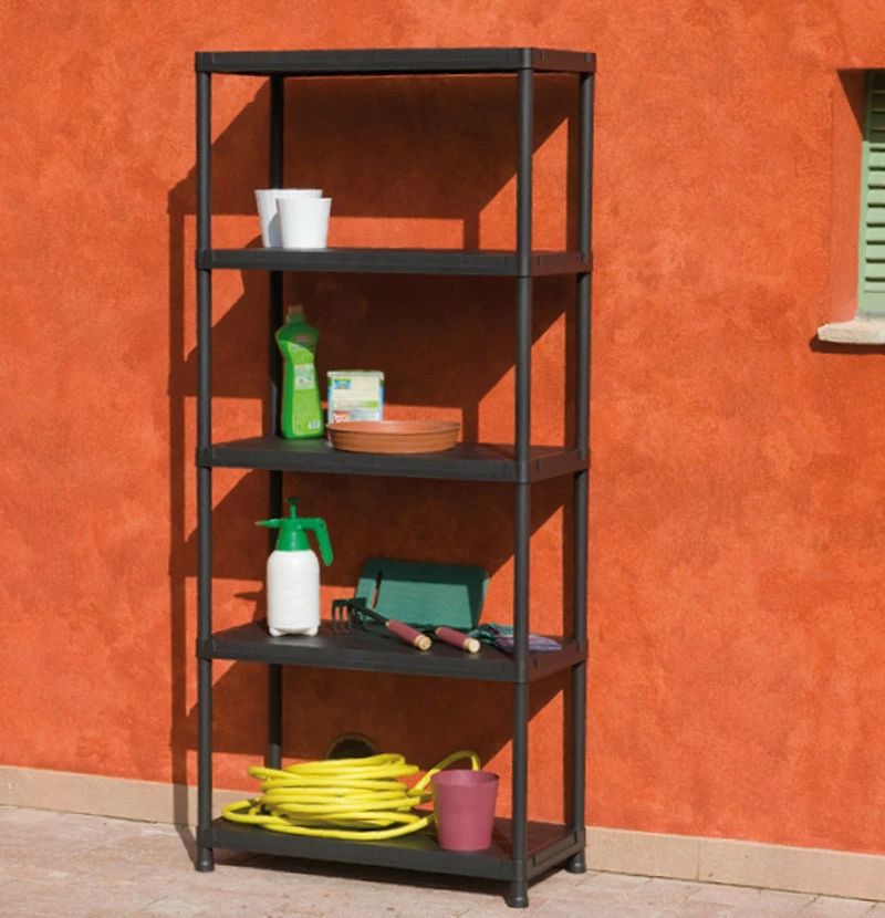 Універсальний пластиковий стелаж на 5 полиць Universal 84-5. Стелаж можна застосовувати для побутових потреб: зберігання будь-яких неважких речей в будинку, гаражі, офісі. Так само, використовують для зберігання або демонстрації товарів в магазинах, торгових рядах, невеликих складах, підсобних приміщеннях. Пластиковий стелаж чорного кольору не мазкий і відмінно впишеться в будь-який інтер'єр. Пластик, на відміну від металу і дерева, не схильний до корозії, йому не страшна волога. Пластикові стелажі не вимагають фарбування, а легка збірка і невелика вага роблять їх дуже практичними і зручними при експлуатації і транспортуванні.