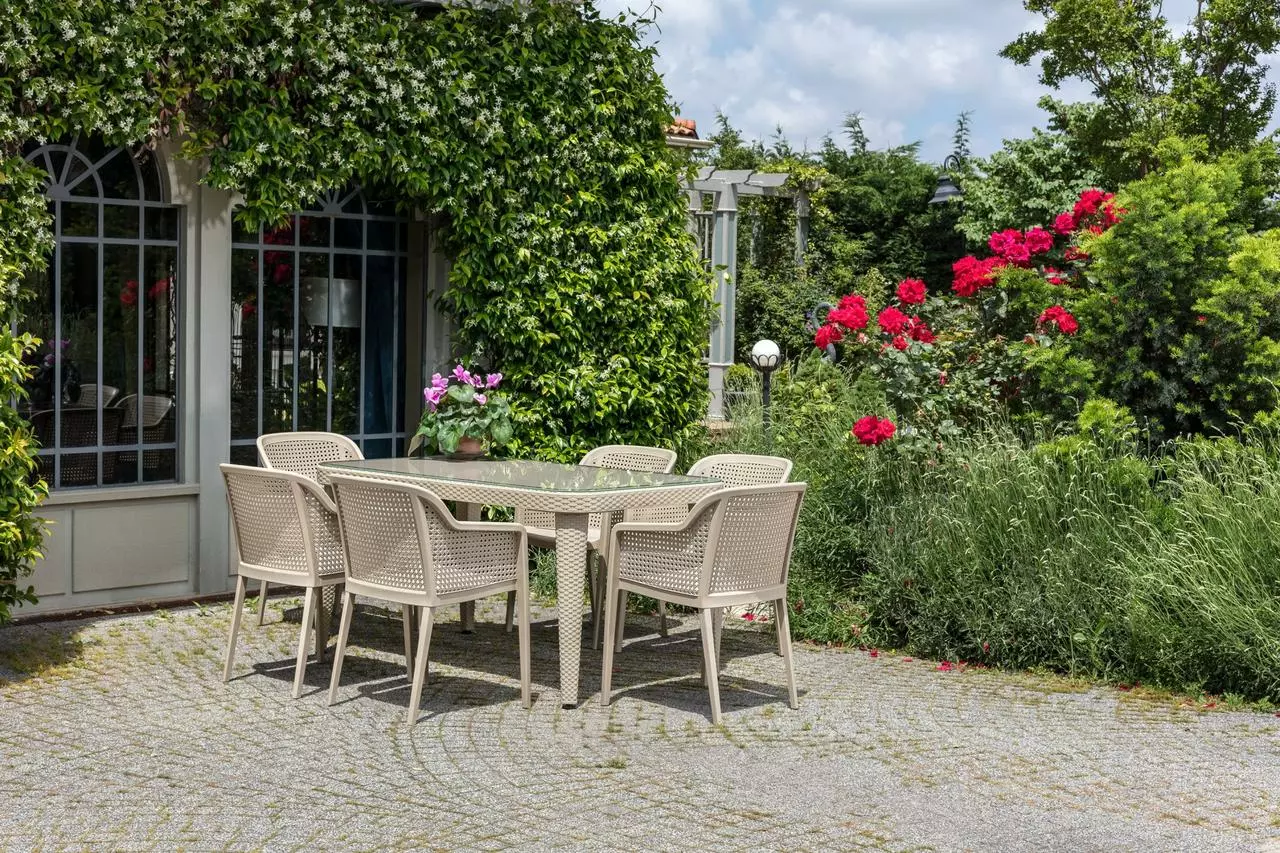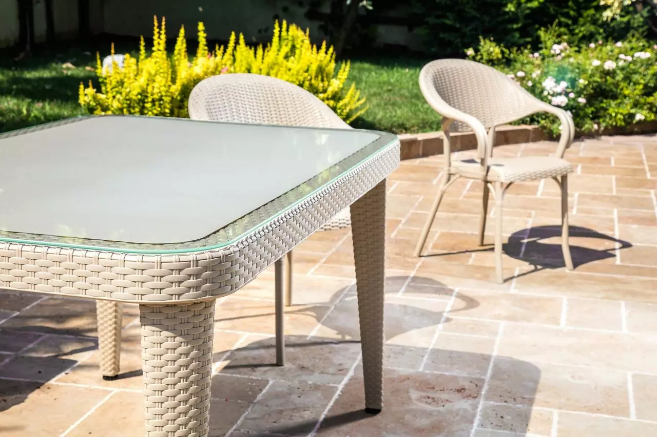Стіл Osaka зі скляною стільницею і каркасом під ротанг чудово підходить для використання, як в класичних так і в сучасних стильових напрямках. Стіл виглядає презентабельно, надає інтер'єру стильності і розкоші. Підходить для використання на вулиці біля басейну, терасах, садах, а також в приміщенні ресторанів, обідніх кімнат і кухонь. Ніжки мають регулювання висоти і ухилу. Матеріали виробу стійкі до перепадів температур, УФ-випромінювання.