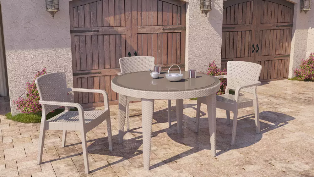 Стіл Osaka зі стільницею із загартованого скла і каркасом під ротанг чудово підходить для використання, як в класичних так і в сучасних стильових напрямках. Стіл виглядає презентабельно, надає інтер'єру стильності і розкоші. Підходить для використання на вулиці біля басейну, терасах, садах, а також в приміщенні ресторанів, обідніх кімнат і кухонь. Ніжки мають регулювання висоти і ухилу. Матеріали виробу стійкі до перепадів температур, УФ-випромінювання.