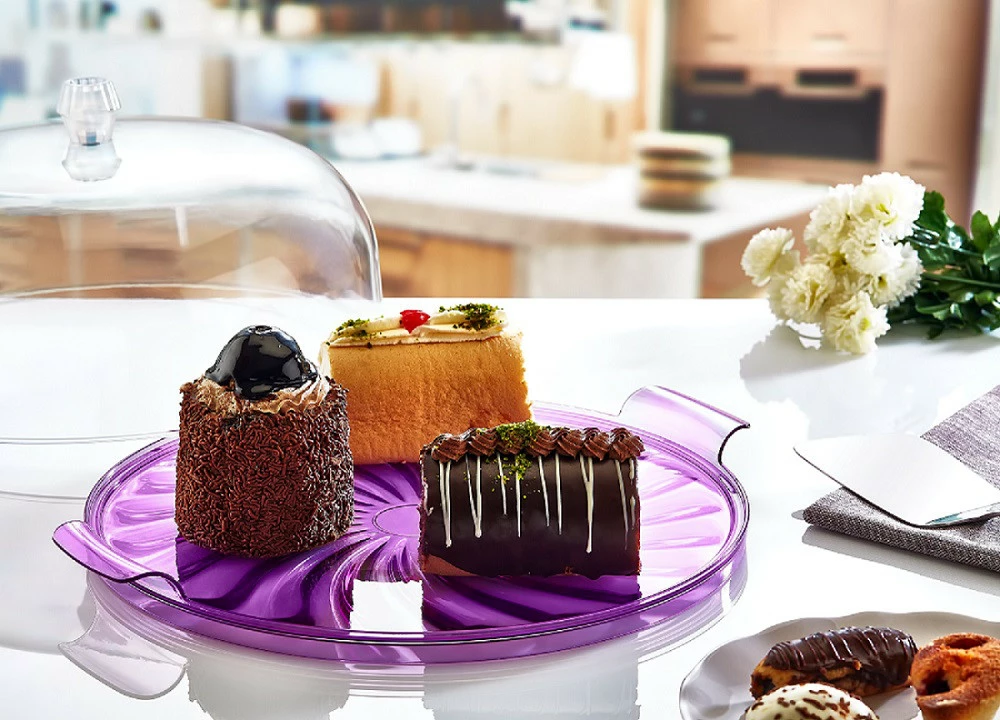 Тортовниця Кристал ідеальна для подачі і зберігання тортів або інших кондитерських виробів. Завдяки прозорій кришці, увага акцентується на вмісті. З боків є ручки для зручного перенесення. Тортовниця виготовлена із високоякісного, прозорого пластика безпечного для контакту з харчовими продуктами.